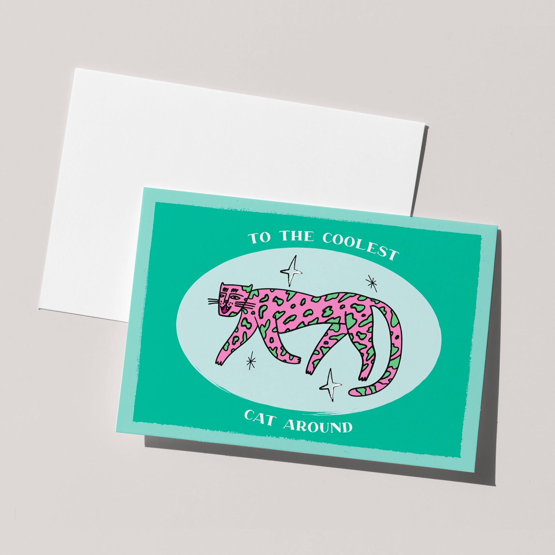 The pink leopard illustration is artfully sketched, showcasing a striking combination of pink fur with distinctive green spots. The surrounding stars add a touch of sparkle and fun. The words "To the Coolest Cat Around" are prominently displayed, delivering a message of admiration and appreciation.