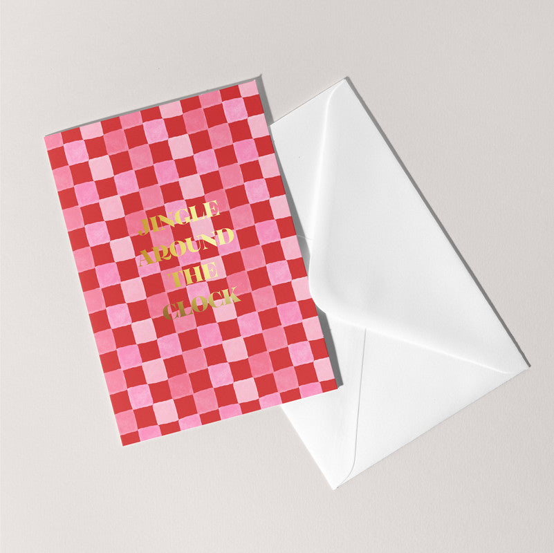 The gleaming gold foil highlights the playful phrase "Jingle Around the Clock," creating a sparkling focal point that captures the essence of festive fun. The combination of the traditional checkered pattern with the sophisticated gold foil makes this card a perfect choice for spreading holiday cheer with style.