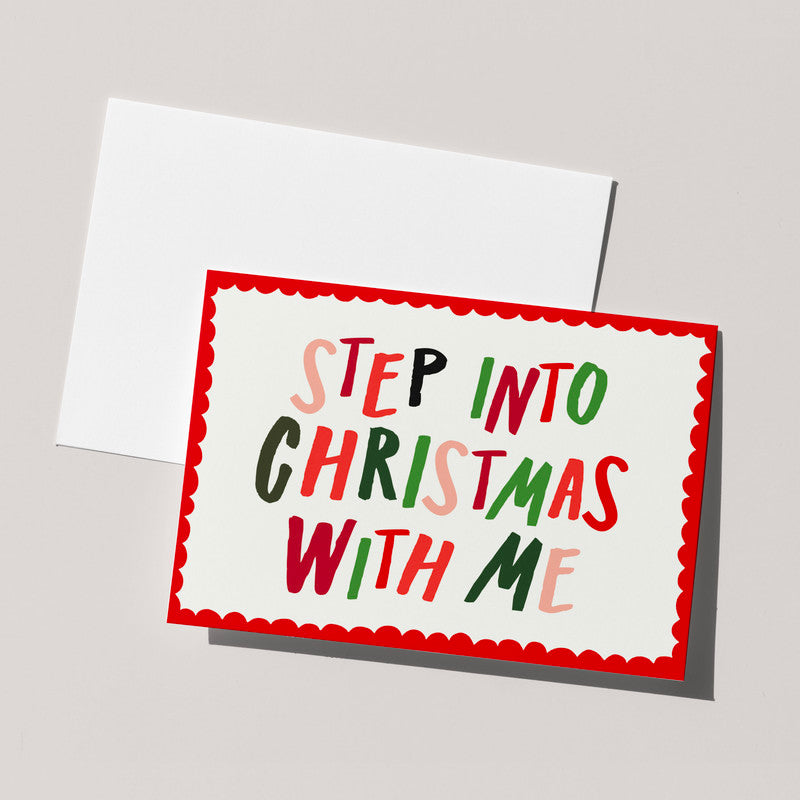 At the heart of the card, the heartfelt message "Step Into Christmas with Me" is elegantly rendered in a charming handwritten style. This personal and inviting phrase captures the essence of togetherness and holiday joy, making it a perfect way to extend your festive greetings.